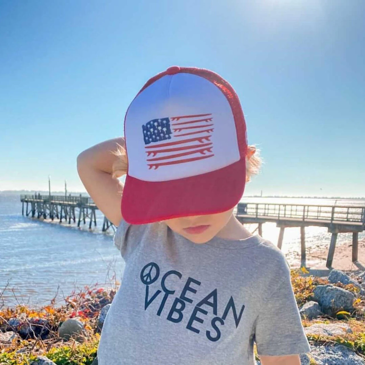 Part of Grom Squad’s Free The Grom’s limited editions, their American Boards patriotic design features an American Flag concept with red surfboards and white space in between as the stripes, and white palm trees set in a blue background as the stars. Not just for the standard American holidays, this hat is a year-round favorite!