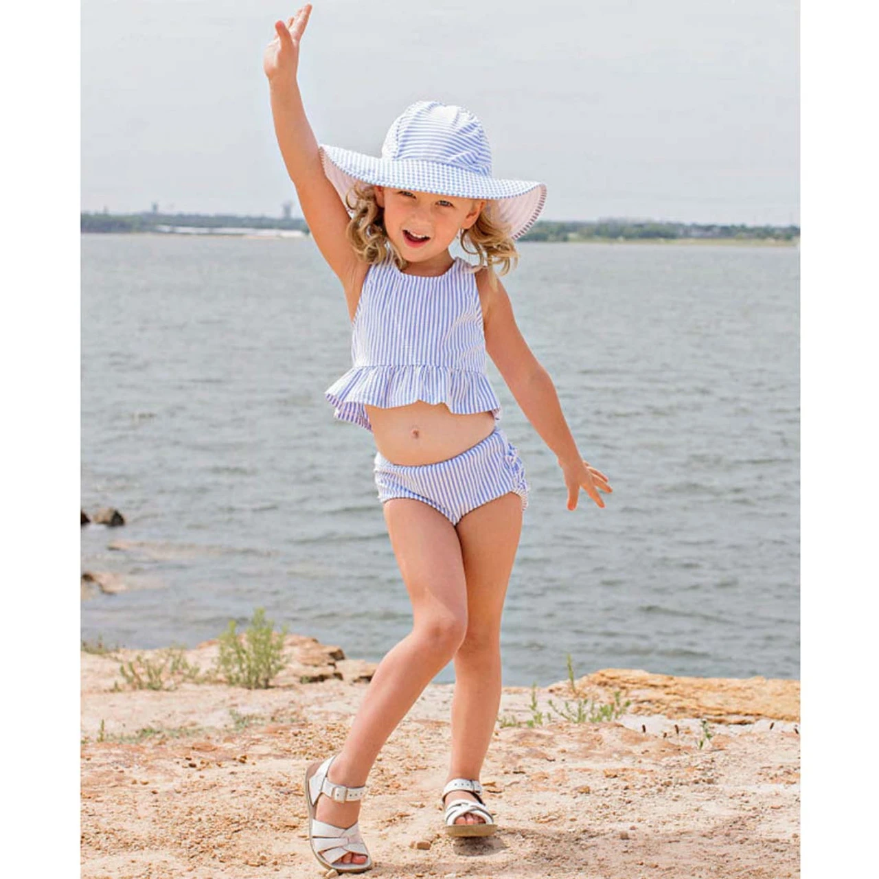 Periwinkle Seersucker is back, and in a preppy peplum silhouette. Signature ruffles and UPF 50+ sun protective fabric make this periwinkle blue swimsuit a must-have for your little one’s vacation wardrobe.